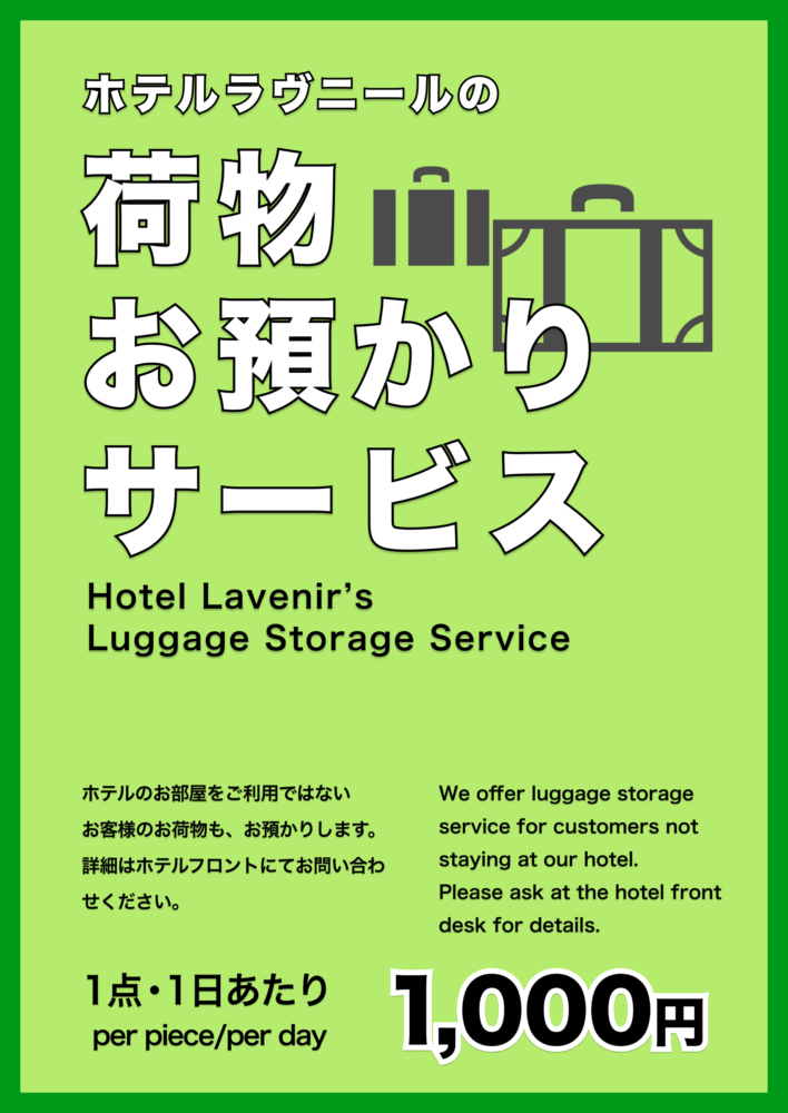 ホテルラヴニールでは、 どなたでも利用できる荷物預かりサービスをスタートしました。 (※ご宿泊予定の方は 無料 です。)